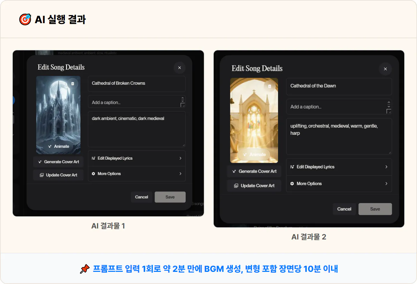💡 세계관 키워드(medieval fantasy)는 그대로 두고 감정 키워드만 교체했을 뿐인데 분위기가 완전히 달라집니다. 탐험 BGM은 어둡고 긴장감 있게, 보상 BGM은 밝고 희망적으로 — 같은 세계인데 장면마다 감정이 달라지는 게 게임 BGM의 핵심입니다.