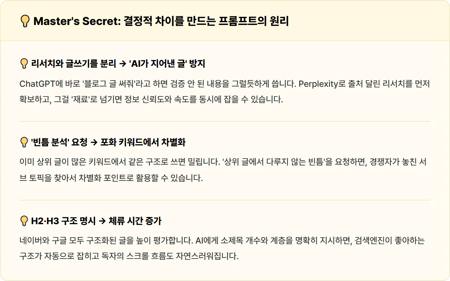 일단 키워드 리서치부터 해요. 네이버 키워드 도구에서 검색량 보고, 경쟁도 체크하고, 연관 키워드 묶어서 메인·서브 나누고. 그다음에 상위 노출 글 5~6개를 전부 열어서 분석해요.