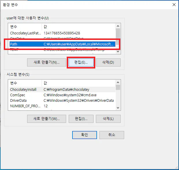 3. 사용자 변수에서 Path 선택 → 편집 → 새로 만들기