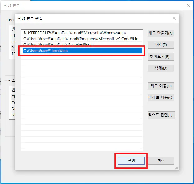 4. C:\Users\내아이디\.local\bin 입력 → 확인 (내아이디 자리에 본인 Windows 사용자 이름)